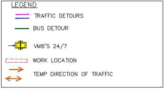 The affected section of the road will be partially closed / closed to traffic north bound, and detour signage will be in place to guide motorists and pedestrians. Access to properties within the closure zone will be maintained via southbound direction. Working hours are scheduled 7am – 5pm. Further detour information is provided on the schematic map below. We understand this may cause some inconvenience and appreciate your patience and cooperation during this time. If you have any questions or concerns, please contact the listed representatives for the works.